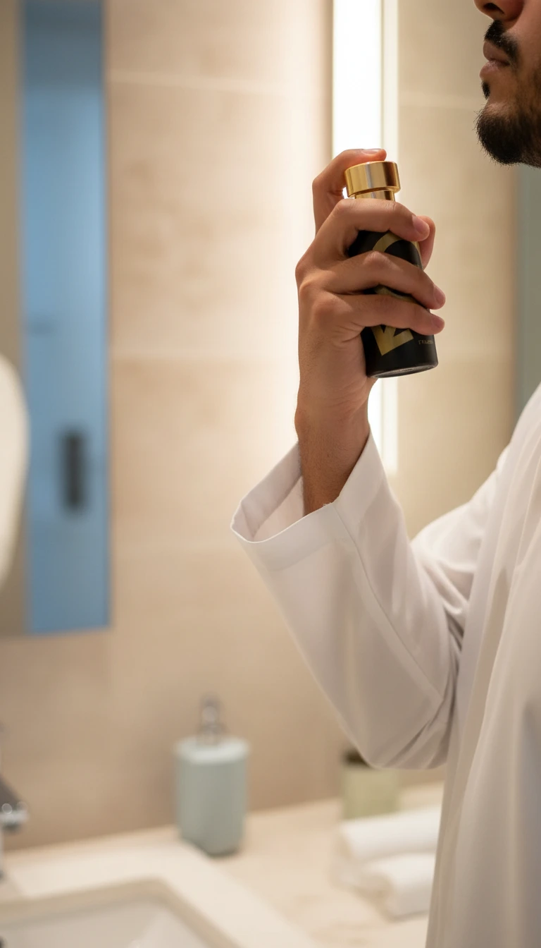 تقدر ترشه أيضاً بخفة على اللبس أو الشماغ لثبات أكثر